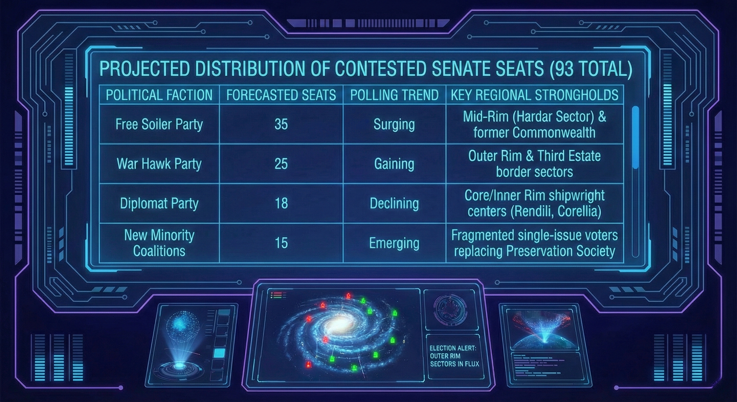 CORUSCANT — The upcoming quarterly election is shaping up to be a historic realignment of galactic politics. With one-quarter of the Senate—93 individual seats—up for reelection, new polling suggests the Free Soiler Party is successfully capitalizing on anti-establishment sentiment across the Mid-Rim, completely upending early forecasts for the Chancellery race.